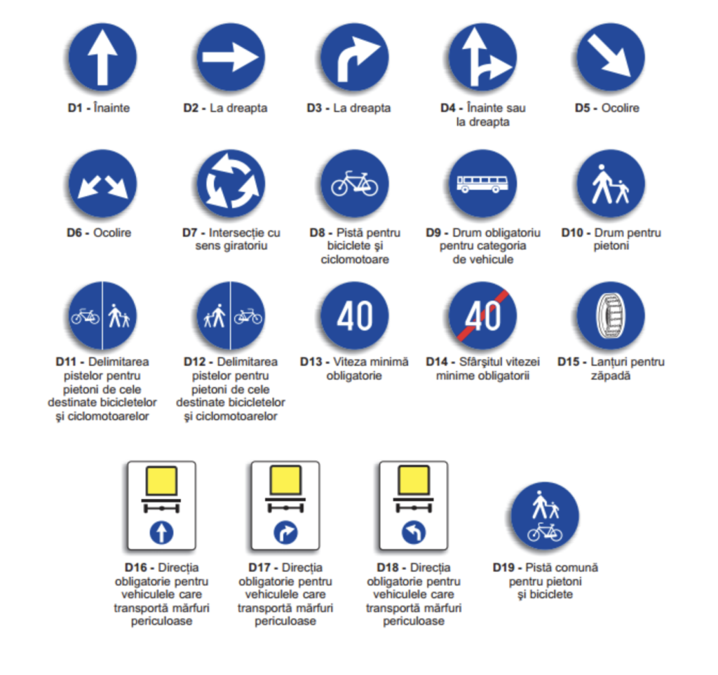 În general, indicatoarele de obligare sunt de formă circulară, cu simbolul alb figurat pe fond albastru. Semnificația indicatoarelor se aplică în imediata apropiere, înainte sau după locul de instalare al acestora.