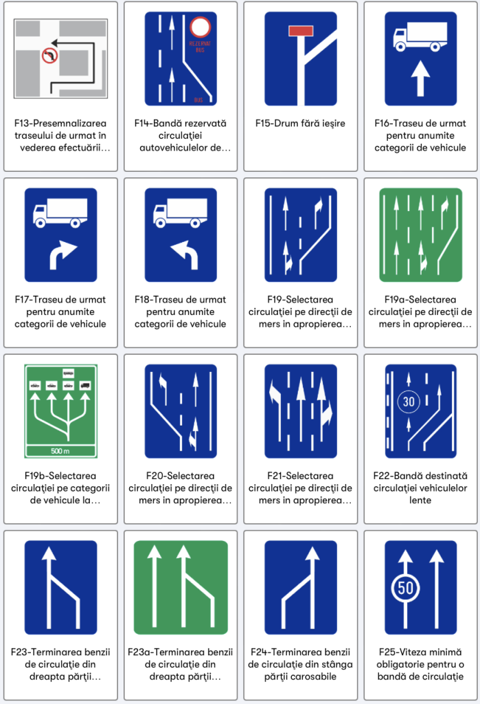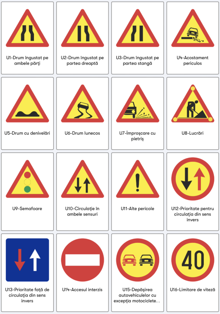 O parte dintre indicatoarele rutiere utilizate cu caracter temporar sunt identice ca imagine cu cele având caracter permanent, cu diferența că fondul indicatorului este de culoare galbenă, iar denumirile unora dintre ele diferă.